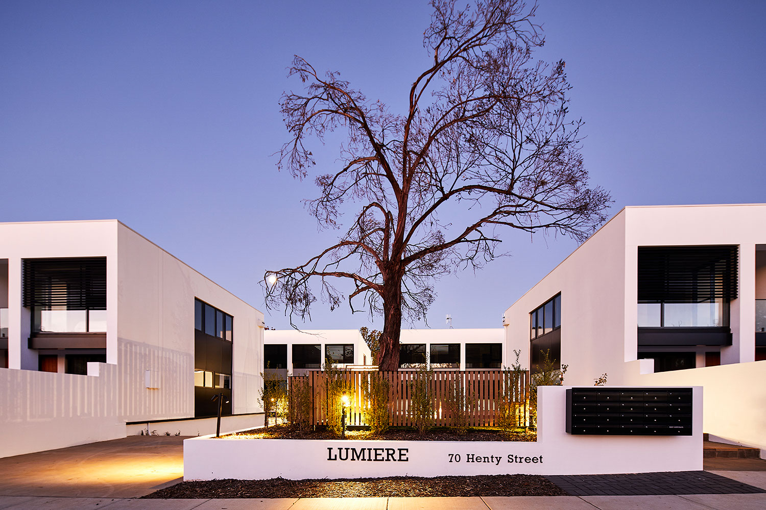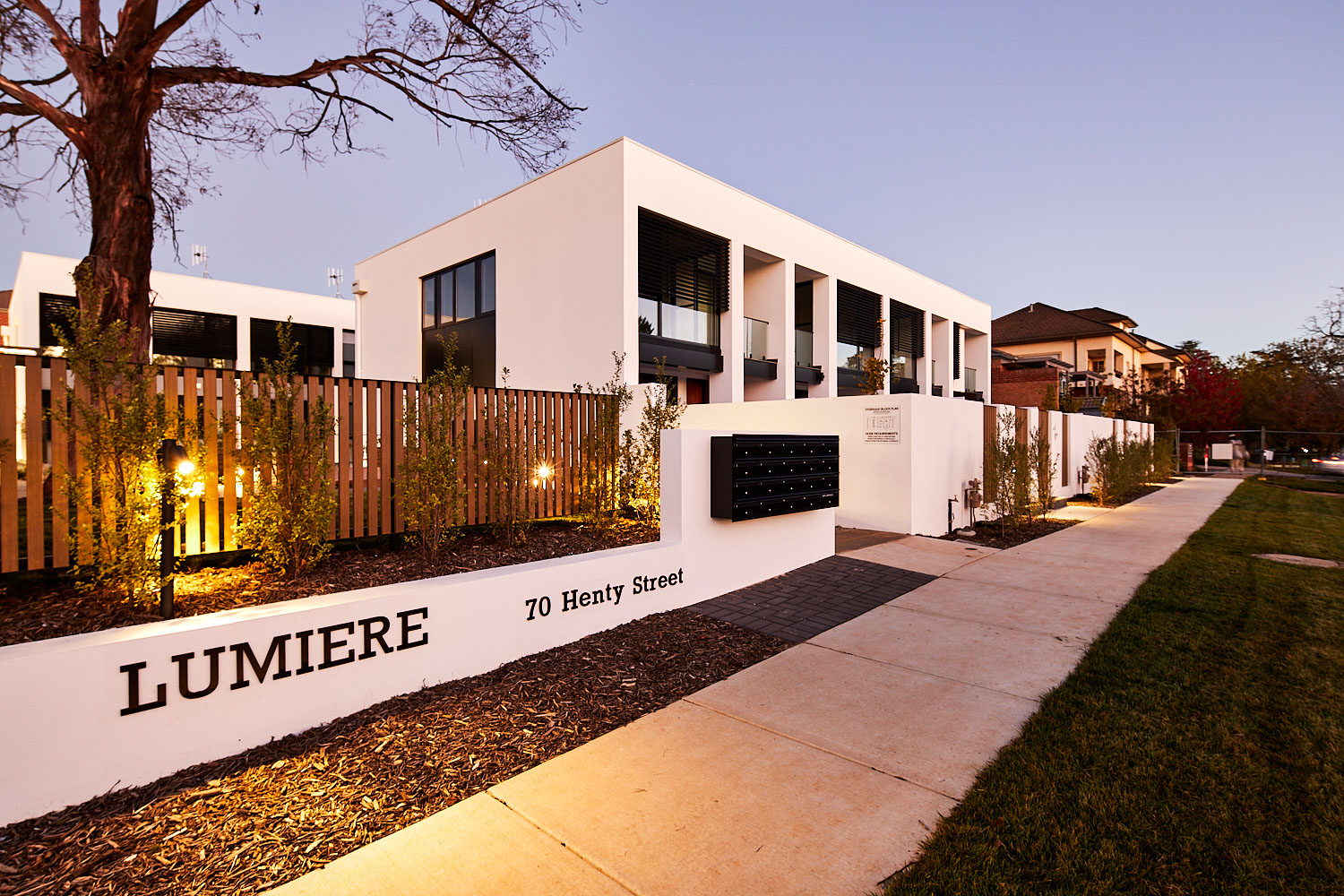 With architect Dane Kasunic, we created buildings with a unique monochromatic articulated cubic facade, in which the highly considered elements work together in harmony to create a unique sense of character and appeal, an instant stand-out. The HENTY residences have been thoughtfully designed for owner-occupiers seeking an urban lifestyle close to the Braddon centre and the CBD. The light-filled spaces within, were designed to entail features typical of modern living: high ceilings, full height glazing, generous kitchens and bathrooms, outdoor areas linked to internal living areas and intelligent storage to maximise the use of space.
