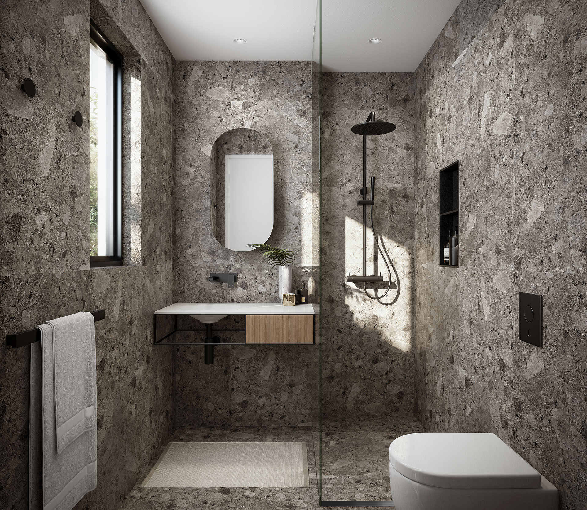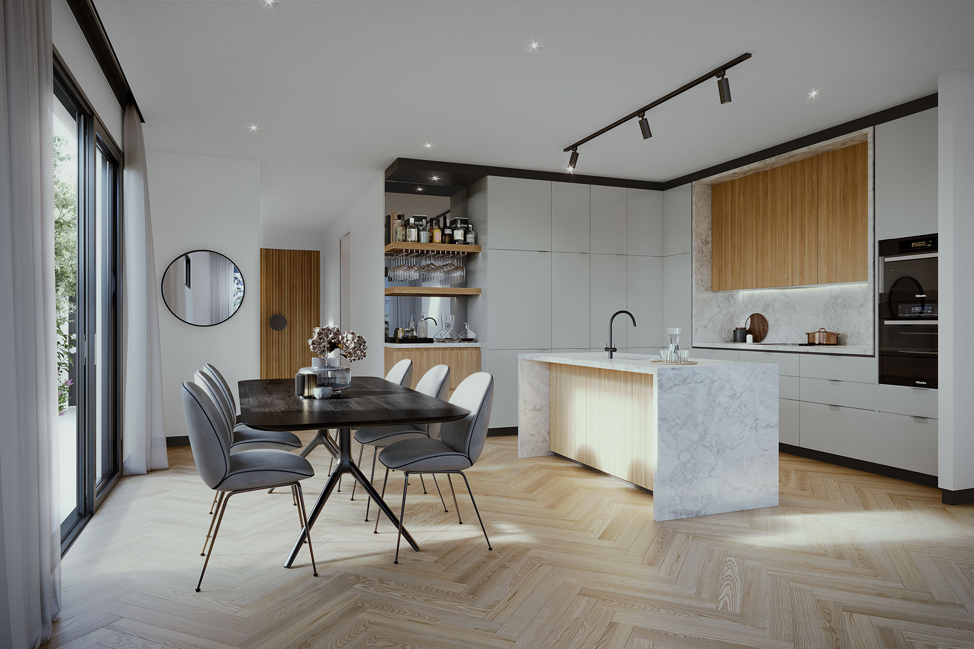 The use of stone to frame out the kitchen cooking hub is complimented by a full suite of Miele obsidian black appliances, built in rangehood and dishwasher, natural matt porcelain tiles to the wet areas, timber veneer joinery, loop piled carpets, herringbone oak flooring, full height floor to ceiling doors, recessed skirtings and matt black tapware. Delivering a timeless refined interior.